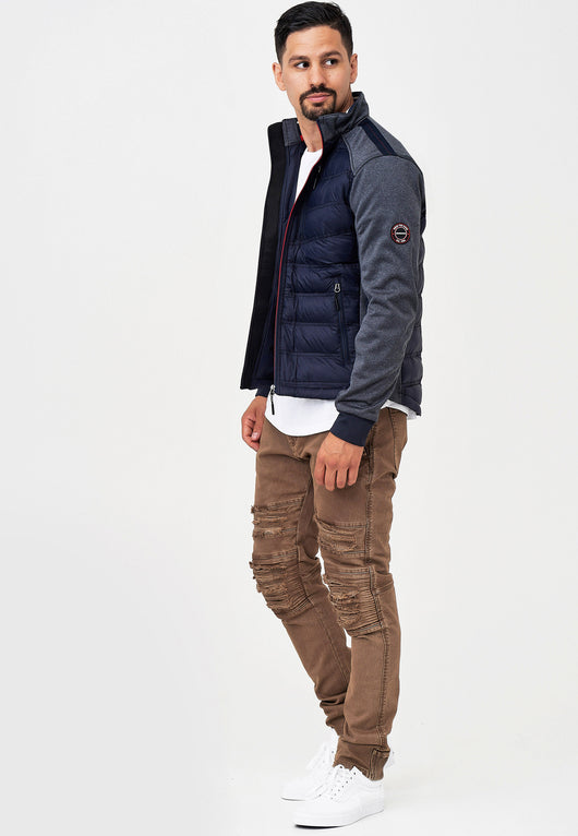 DETAILS & HIGHLIGHTS: sporty transition jacket, quilted look, raglan sleeves, sleeves made of softshell material with soft fleece inside, two side pockets with zips, logo patch, elastic cuffs, sleeves and hem, contrasting color zip